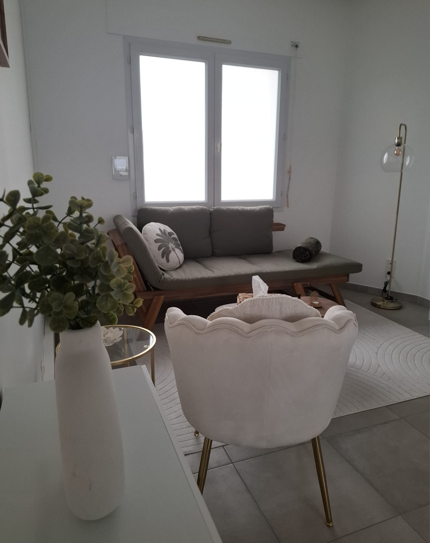 Le cabinet a été pensé comme un espace apaisant, où chaque détail invite à ralentir et à se recentrer. La lumière naturelle, les teintes douces et les lignes épurées créent une ambiance harmonieuse, propice à la détente du corps et de l’esprit. Ici, rien n’est superflu : l’essentiel se trouve dans la sensation d’équilibre et de calme qui se dégage du lieu. Cet environnement sobre et lumineux permet à chacun de se sentir accueilli pleinement, dans un cadre qui inspire confiance et douceur.